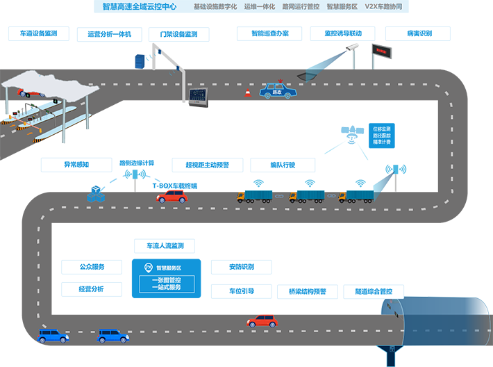 作为智能交通行业的一员,东方世纪积极响应《交通强国建设纲要》及“新基建”交通领域的整体规划和需求,以数字化、网络化、智能化为主线,利用物联网、云计算、大数据、人工智能、V2X等新技术和理念,结合北斗高精定位与5G通信,打造覆盖“人、车、路、环境”的智慧高速综合数字平台,实现路网及基础设施的全天候、多要素的状态感知,建设监测调度、应急管控、自由流稽查、多元化服务及车路协同为一体的智慧高速全域运控中心,分别由基础设施数字化、运维一体化、路网运行管控、智慧服务区及车路协同等5大场景组成。