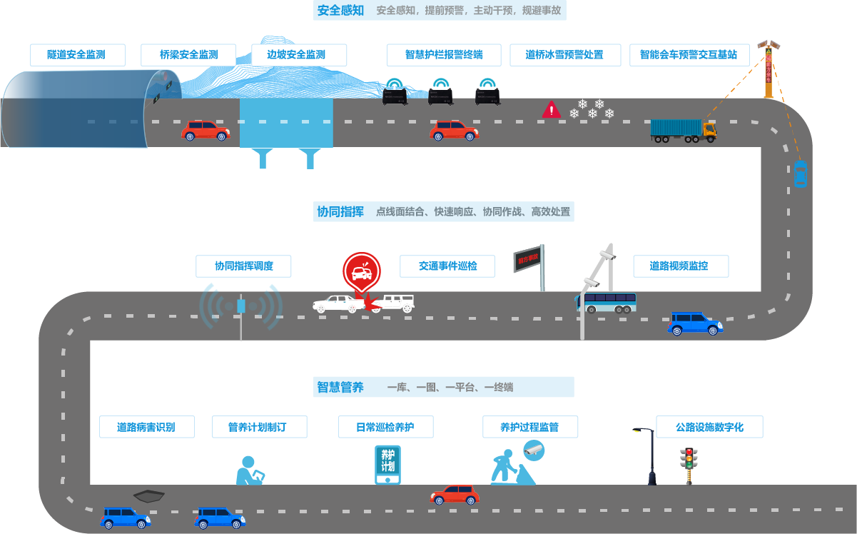 如果说高速公路被称为“大动脉”,普通干线公路则是一条条“支路”和“毛细血管”,是连接城市与乡镇群落间重要通道。在日常出行、短途运输、景区旅游等方面,和广大人民群众息息相关。出行密度大,通行频率高。同时,相对于 高速公路、城市交通来说,普通干线公路车速较高、场景多样、路况复杂; 通行车速低于高速公路,高于城市交通;车辆、行人混合行驶,山区的陡坡、弯道、桥梁隧道,城镇道路的平交路口、交汇路口,乡村路的车人混合通行,等等都为干线公路的交通出行、管养维护提出了挑战;在干线公路要处理和面临的事项方方面面,我们聚焦于道路的安全感知、出行畅通及施工管养三个方面,助力交通管理部门,共同打造 “畅、安、舒、美”的公路出行环境。